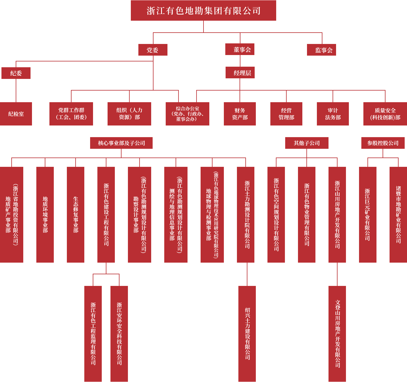 集團公司下設(shè)浙江有色建設(shè)工程有限公司、浙江有色勘測規(guī)劃設(shè)計有限公司、浙江土力勘測設(shè)計院有限公司、浙江有色地球物理技術(shù)應(yīng)用院有限公司、浙江省地勘投資有限公司、測繪與地理信息事業(yè)部、地質(zhì)礦產(chǎn)事業(yè)部、地質(zhì)環(huán)境事業(yè)部和生態(tài)修復(fù)事業(yè)部等子公司和產(chǎn)業(yè)部。